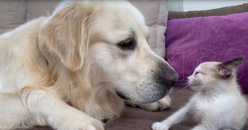 Precious Kitten Meets Funny Golden Retriever For The First Time And They Become Fast Friends