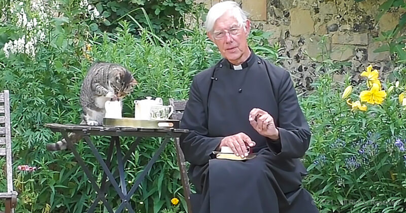 A cat reminds us that no matter who you are, cats will do as they please. During morning prayer service, the Dean’s own cat strides onto the set like he owns the place, which he probably does, and helps himself to some of the unprotected mugs of milk.