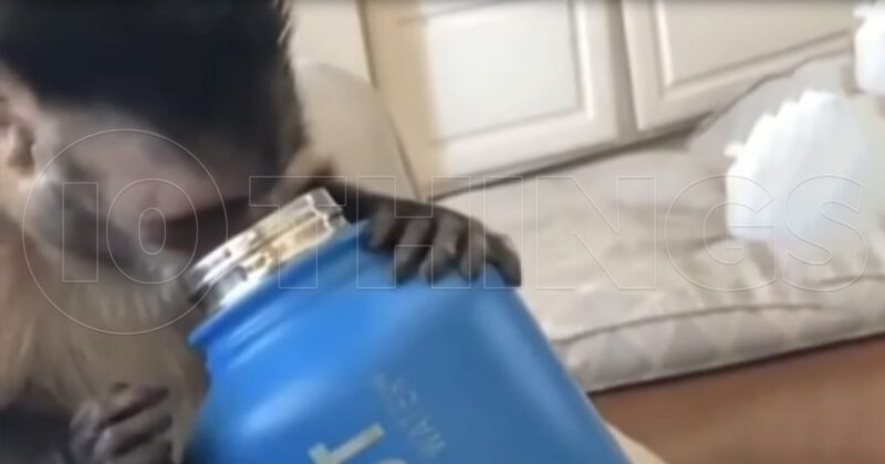 Monkeys are so curious, and this little one is cute, too! He quickly opens up the box, eager to see what is inside. It turns out it is his new water bottle. However, there is no water in it—poor little monkey.