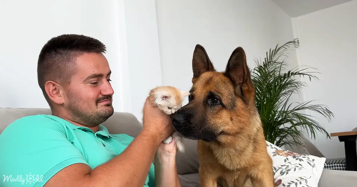 Despite their size difference, the kitten appears utterly at ease in Rocky’s company. The German Shepherd continues to observe her, his head slightly tilted as if trying to decipher the mysterious ways of this tiny creature. The owner’s gentle pat on Rocky’s head seems to reassure him, a silent affirmation of love and appreciation for his newfound guardianship.