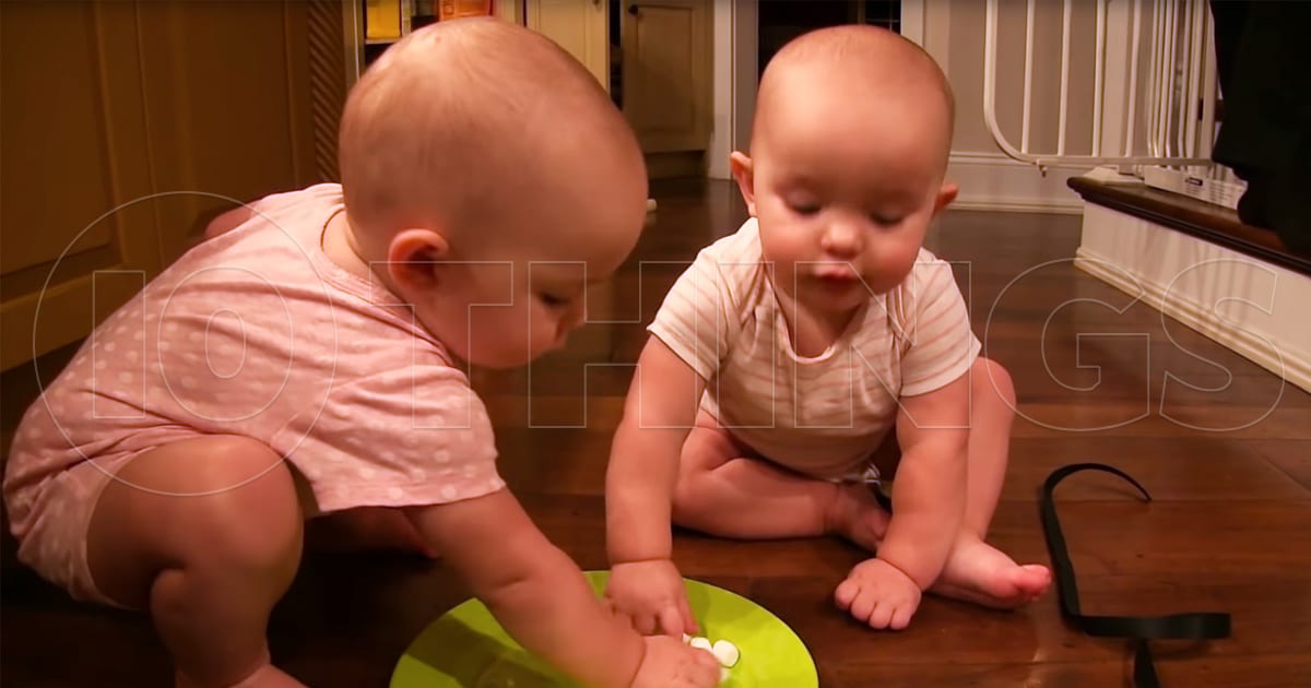 Hungry Twin Babies Snack on Plate of Marshmallows