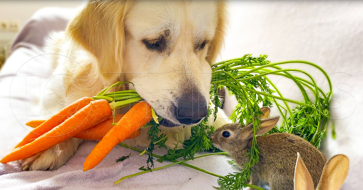 Lovable Golden Retriever Serves Baby Bunnies Carrots for Lunch