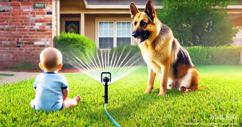 German Shepherd battles ‘evil’ sprinkler to protect baby boy
