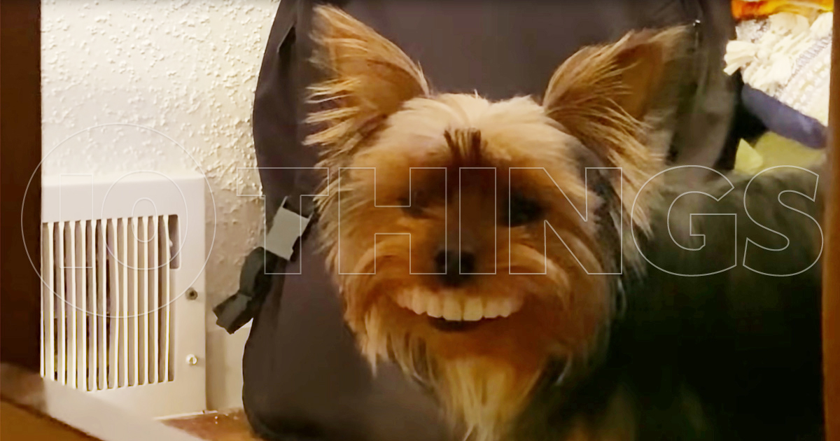 Instead of stealing away the giant set of teeth, Thomas ended up with them perfectly placed in his face. His owner couldn’t have done it better if he tried.