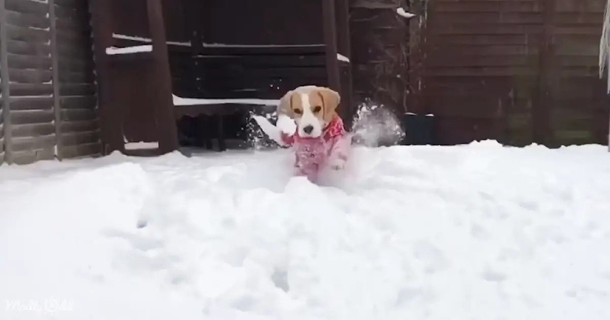 The video also features a Beagle bravely navigating deep snow to return home. Along the way, the dog gets covered in snowflakes, adding to the charm. A Doberman is also playfully holding a shovel in its mouth in a snowy garden. The owner’s surprised reaction in the background highlights the dog’s playful nature.
